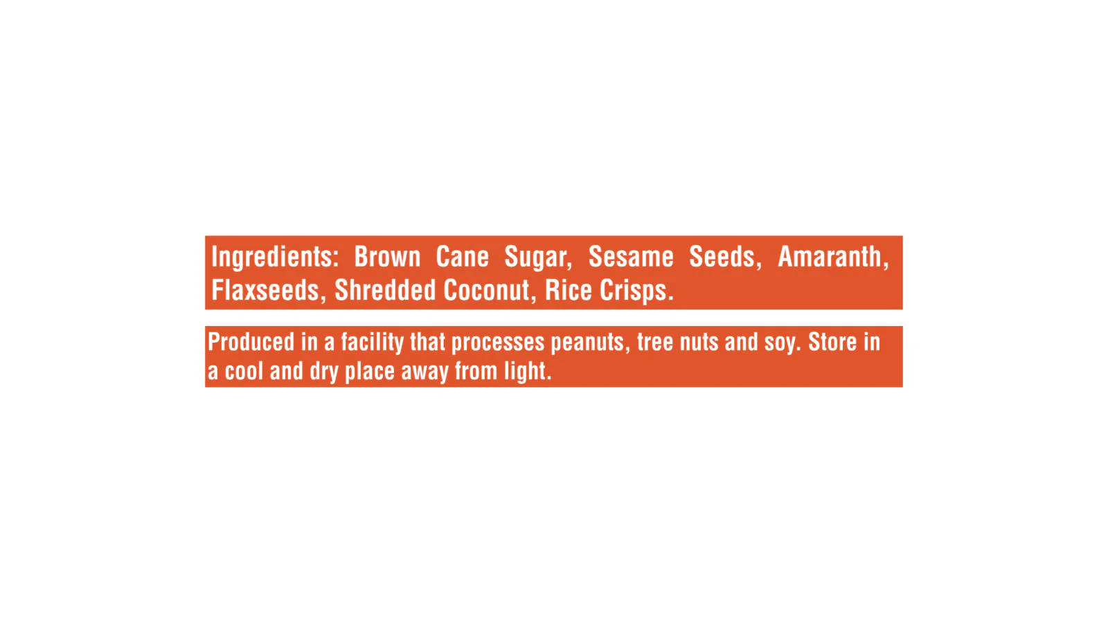 Brown Cane Sugar, Sesame Seeds, Amaranth, Flaxseeds, Shredded Coconut, Rice Crisps